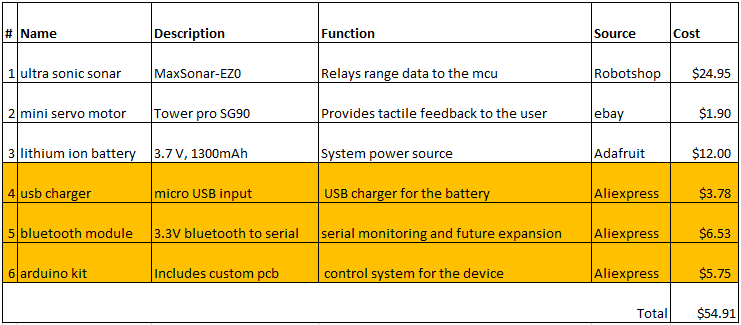 After discussing this issue with my professor, it was agreed that I need to specify some important requirements for the battery. First of all I must make sure the voltage is high enough to support the motor. Second, I need to make sure the battery life is large enough to last through an entire day. It will be pointless to have a device that can only last a few hours. If this device is to be used in every day life it must at least work through 8 or more hours of continuous use. Since the maximum current draw for the motor at the nominal 4.8V is around 300 mA, I would need a power source that can provide at least 2000 mAh to get the 8 hours of continuous usage that I need. Also, in order to make this device easier to handle by the visually impaired, the batteries would also have to be rechargeable so that the user does not have to mess around with the inner components of the device.