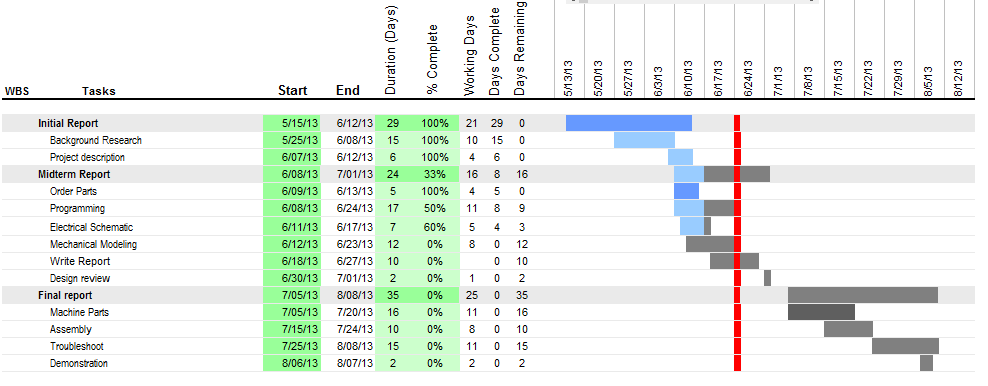 Now that the power supply and the electronic components are figured out, I need to start modelling the mechanical housing that will store all these components. Switching the power supply is a big change in my design and will require some hacking of the battery charger to make it fit with my device. I am aiming to do some mechanical models for the upcoming weeks. The updated gant chart for my progress is shown below.