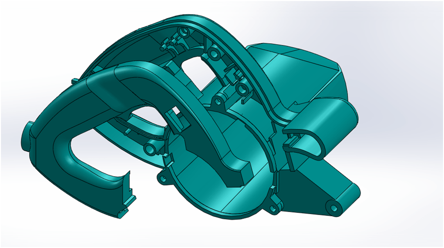 The irregular shape of the handle and the motor housing makes it a challenging set of objects to measure and shape in SolidWorks. Many surfacing techniques were used to get the exterior and interior features to be correct.