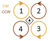 The basic operation of any quadcopter device is very simple; all you need to do is provide enough thrust from the propellers (props) to balance out the weight of the craft. The difficult part is to control the speed of the four motors so the device can remain level and stable during flight. Luckily, the AeroQuad software provides much of the needed PID computations and it can allow up to 8 rotors to be controlled at once. One important key to having a successful flight is to have the correct motor orientation for the motors and propellers. During flight, the rotorcraft is under the influence of the torque effect which causes the body of the craft to spin in the opposite direction of the rotors. That’s why it’s important to buy props with both normal and counter rotating blades. The flight configuration that matched our quadcopter was the Quad X configuration as pictured here. Motors are labeled sequentially in a clockwise direction starting from the front left motor.