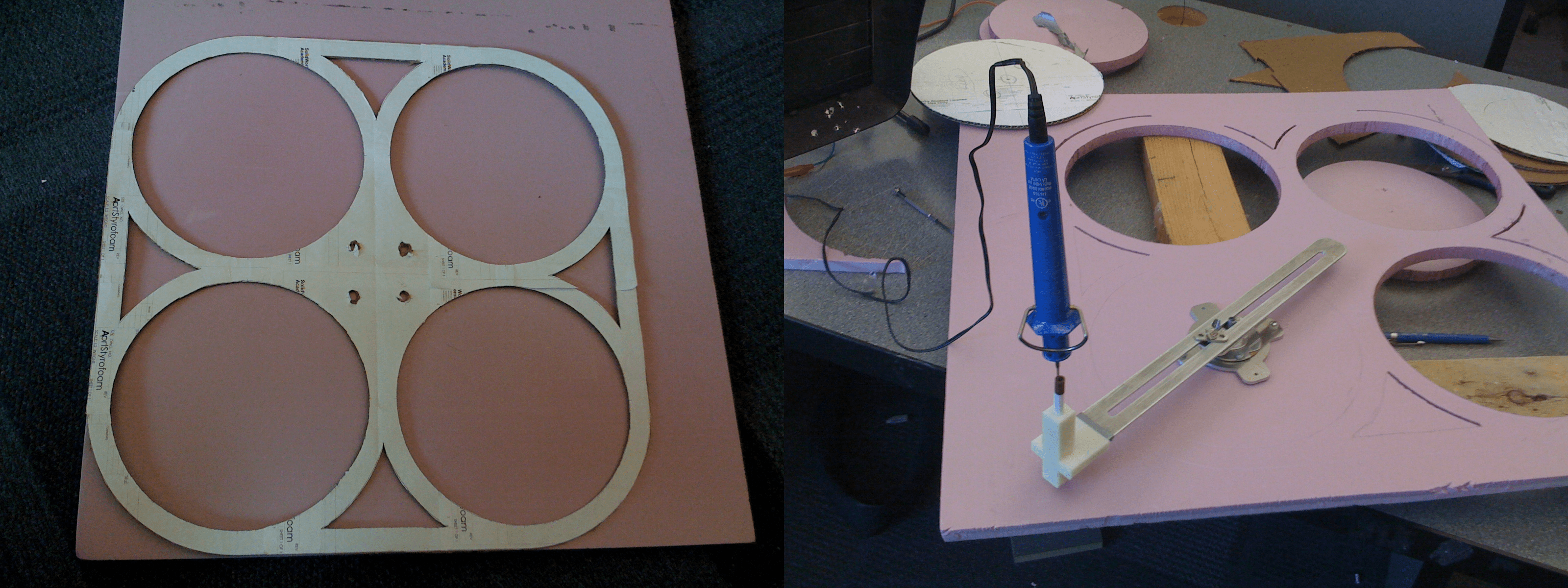 For the safety of the craft and of those around it’s flight zone, we wanted to build some sort of protector around the quadcopter. The CAD model that was drawn for the Styrofoam protector was converted into a template which was then used to trace the lines where the Styrofoam needed to be cut. The circles and curves were cut using a custom-made compass device with a Styrofoam cutter attached to the end.